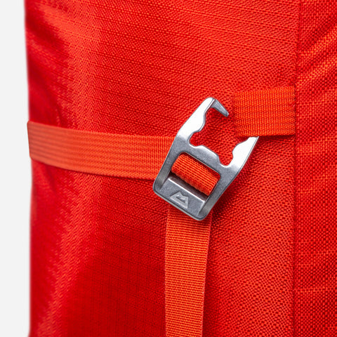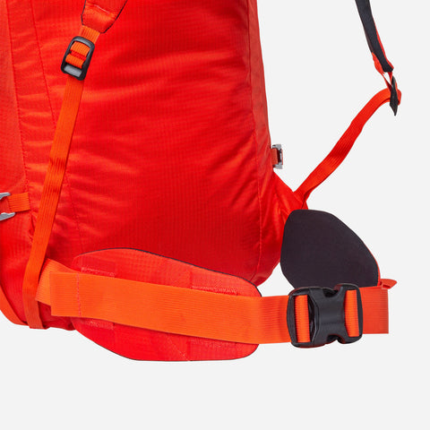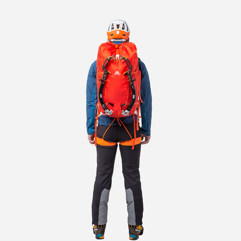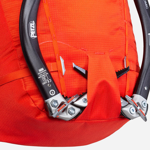 A streamlined hourglass shape facilitates packing and offers a more stable carry for both hiking and climbing, while an EVA back panel provides support and improves comfort. Similarly, high-density EVA foam shoulder straps are low profile to facilitate mobility when climbing, but still offer excellent carrying performance on long walk-ins. Side compression straps with lightweight aluminium buckles improve load stability and can accommodate items such as sleeping mats or even skis. Likewise, aluminium ice axe toggles and bungee cord system offer greater carrying potential. To shed weight for hard ascents or summit pushes, the back panel, hip fins, compression straps, bungee and ice tool toggles can all be stripped if not required.