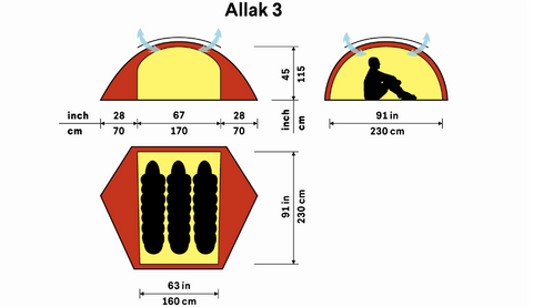 SINCE ITS INTRODUCTION over 10 years ago, the two-person Allak has been one of our most popular tents. For 2019, we are introducing a three-person version, the Allak 3, and renaming the original model the Allak 2. Both remarkably light yet impressively strong Allak models are well-suited for anything from summer paddling to winter ski mountaineering, and from year-round backpacking to all-season peak bagging. They are easily light enough for mobile journeys, where you move your camp every day, and their two-entrance construction allows for superb ventilation options in warm weather. At the same time, the Allak's three-pole dome structure is strong enough for summer or winter base camp use in all but the worst conditions, and the fully freestanding construction make it ideal for tough pitching conditions, such as rocky ground and sand. In addition, its two integrated vestibules are set parallel to the sleeping area, giving excellent access to gear storage space as well as ease of entry and exit. Since its introduction, paddlers have valued the Allak’s ability to be pitched nearly anywhere, while backpackers choose it for its roomy stability and light weight. Mountaineers appreciate both the Allak’s freestanding design, compact footprint, and its roominess, as well as its ability to deal with snow loading. And taller adventurers find its length a welcome comfort.